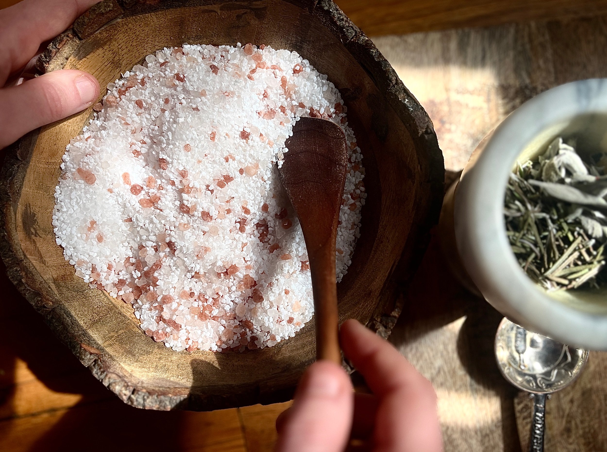 Add a generous handful to warm running water. As the salts dissolve, take a moment to set an intention—release, soften, let go. Soak for at least 20 minutes.